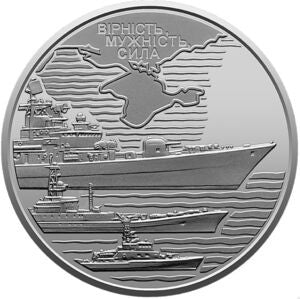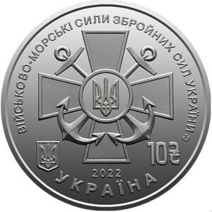Awers: Godło Marynarki Wojennej Sił Zbrojnych Ukrainy, u dołu data 2022, po lewej mały herb państwowy Ukrainy, u dołu po prawej, nominał 10 (hrywien) oraz logo Mennicy Narodowy Bank Ukrainy. Motyw w półokręgu u góry ВІЙСЬКОВО-МОРСЬКІ СИЛИ ЗБРОЙНИХ СИЛ УКРАЇНИ (Wojskowe i morskie siły Sił Zbrojnych Ukrainy), na dole nazwa państwa УКРАЇНА (Ukraina) .