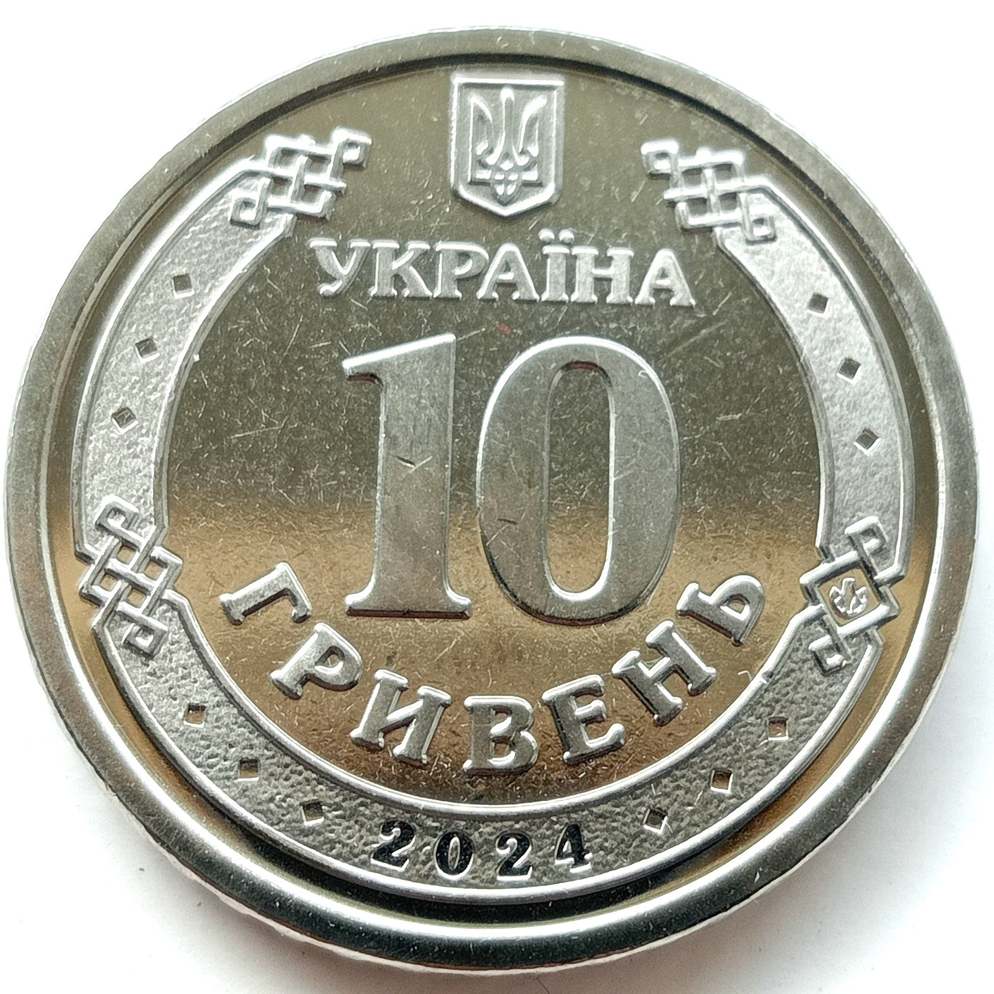 Awers: W centrum duża cyfra nominału 10, waluta poniżej ГРИВЕНЬ. U góry mały herb, kraj poniżej УКРАЇНА. Ozdobna ramka dookoła, data u dołu 2024, znak mennicy po prawej stronie w romb „lilia”.