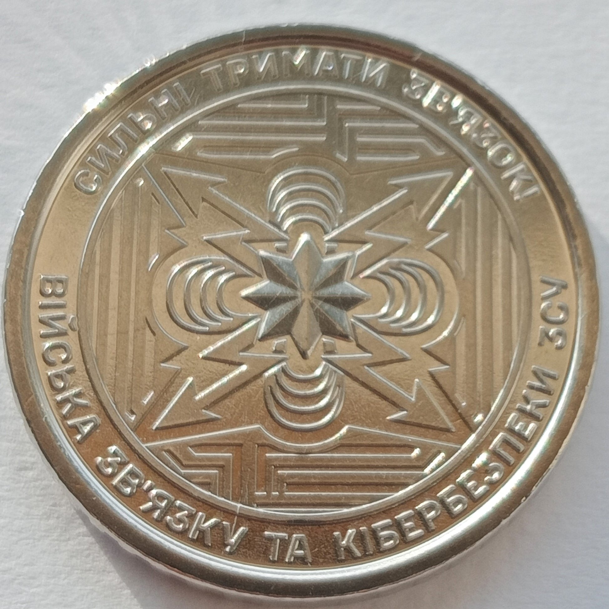 Rewers: W okręgu tarcza chroniąca przestrzeń informacyjną, jest emblematem Oddziału Łączności i Cyberbezpieczeństwa Sił Zbrojnych Ukrainy, z ośmioramienną gwiazdą u podstawy, otoczoną orbitami w kształcie krzyża i skrzyżowanymi piorunami. Tło monety przedstawia stylizowane labirynty symbolizujące transmisję zaszyfrowanych danych przez skomplikowane zabezpieczenia cyberprzestrzeni, gdzie toczy się niewidzialna wojna. Motto na górze СИЛЬНІ ТРИМАТИ ЗВ’ЯЗОК! (Państwowa Specjalna Służba Transportowa), temat na dole ВІЙСЬКА ЗВ’ЯЗКУ ТА КІБЕРБЕЗПЕКИ ЗСУ