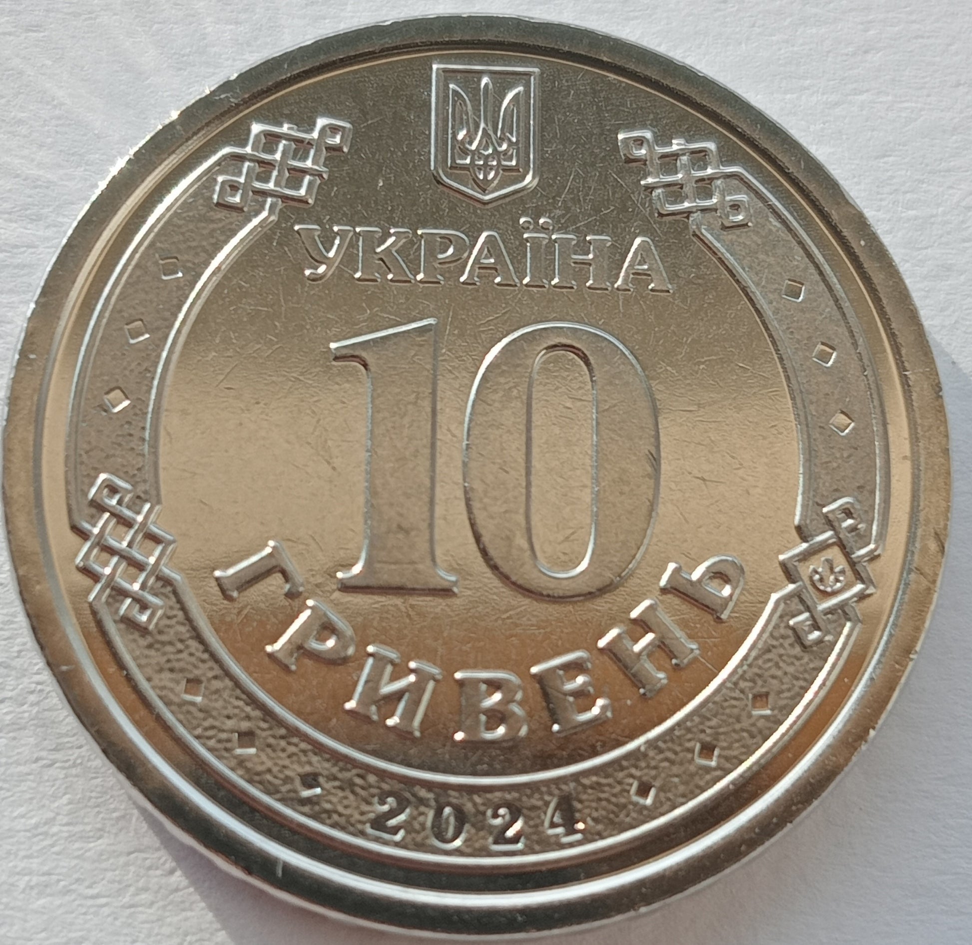 Awers: W centrum duża cyfra nominału 10, waluta poniżej ГРИВЕНЬ. U góry mały herb, kraj poniżej УКРАЇНА. Ozdobna ramka dookoła, data u dołu 2024, znak mennicy po prawej stronie w romb „lilia”.