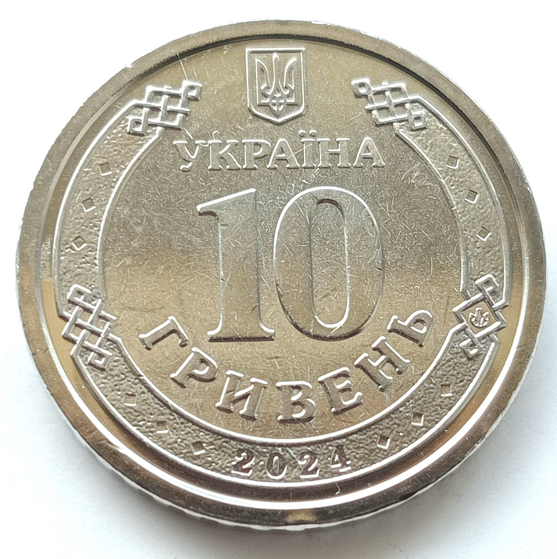 Awers: W centrum duża cyfra nominału 10, waluta poniżej ГРИВЕНЬ. U góry mały herb, kraj poniżej УКРАЇНА. Ozdobna ramka dookoła, data u dołu 2024, znak mennicy po prawej stronie w romb „lilia”.