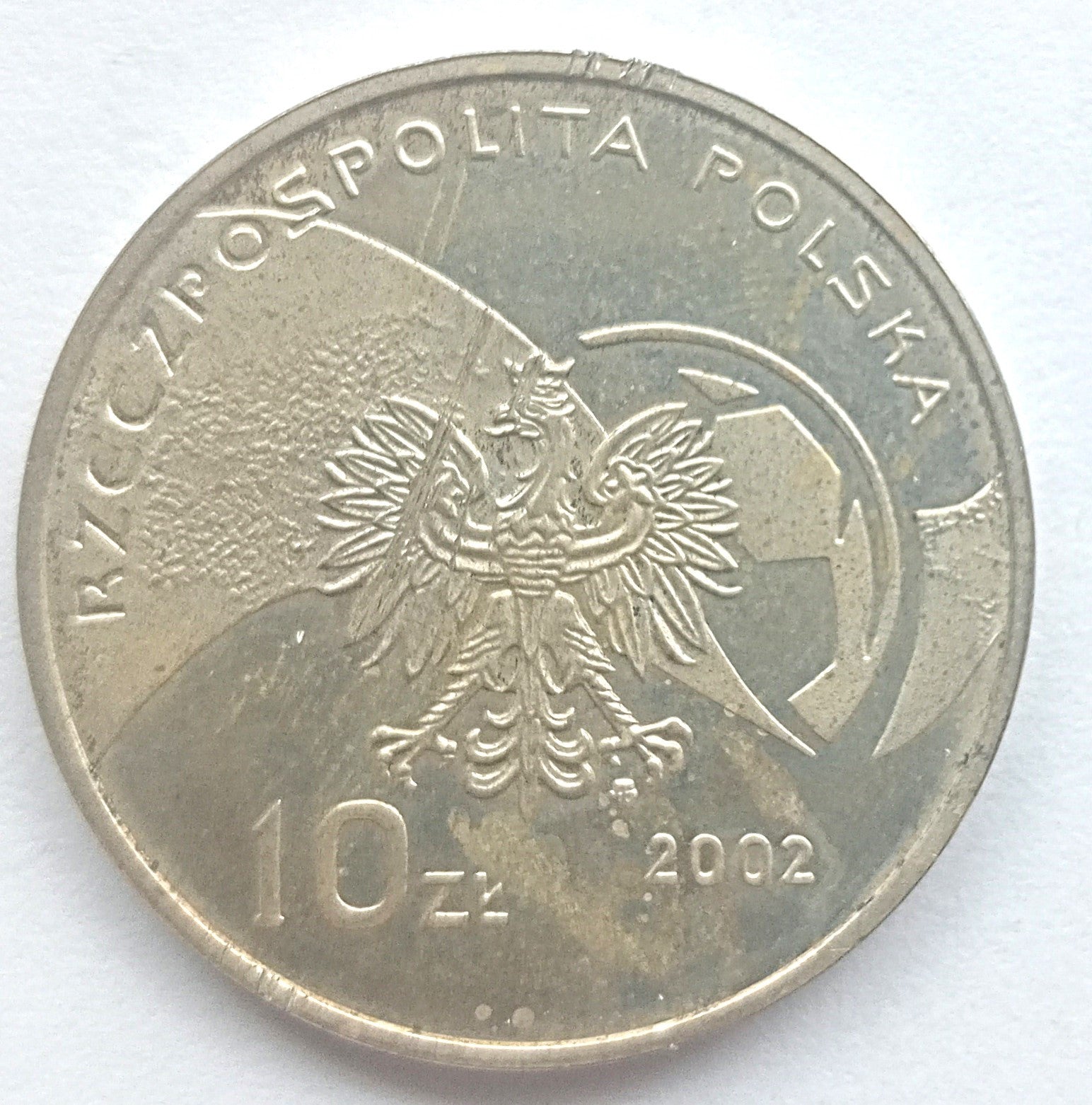 Awers: U góry półkolem napis: RZECZPOSPOLITA POLSKA. Na tle stylizowanych mapy świata i piłki: wizerunek orła, pod jego lewą łapa znak mennicy. Wartość nominalna z lewej strony na dole: 10 ZŁ, po prawej rok emisji