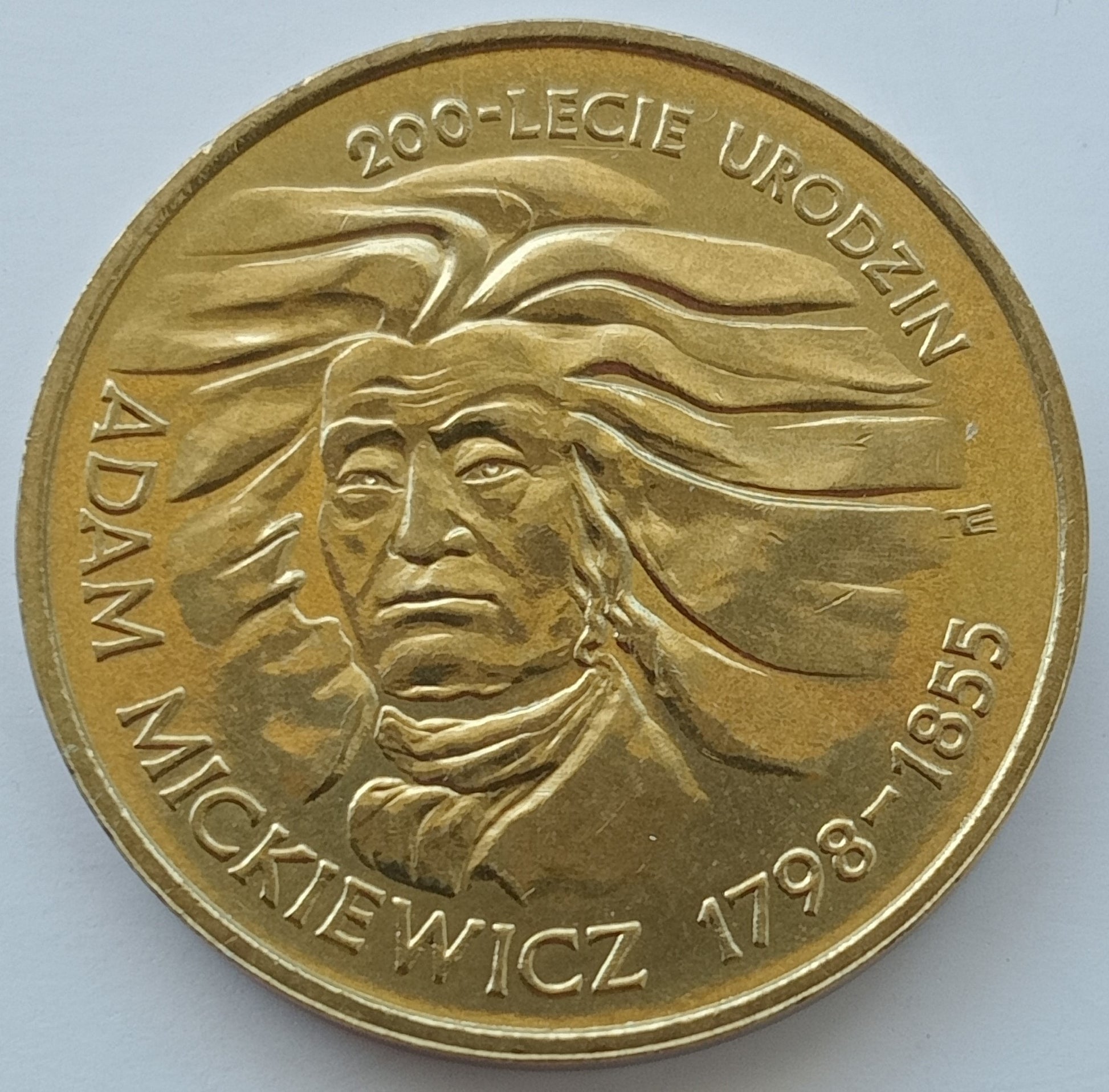 Z okazji 200 urodzin wieszcza narodowego Adama Mickiewicza wyemitowano monetę z jego wizerunkiem na rewersie. Stało się to w 1998 roku. Projektantką była Ewa Tyc-Karpińska. Na awersie pełna nazwa państwa RZECZPOSPOLITA POLSKA, orzeł biały, który pod pazurami ma znak mennicy, rok emisji 1998 i nominał "zł 2 zł".