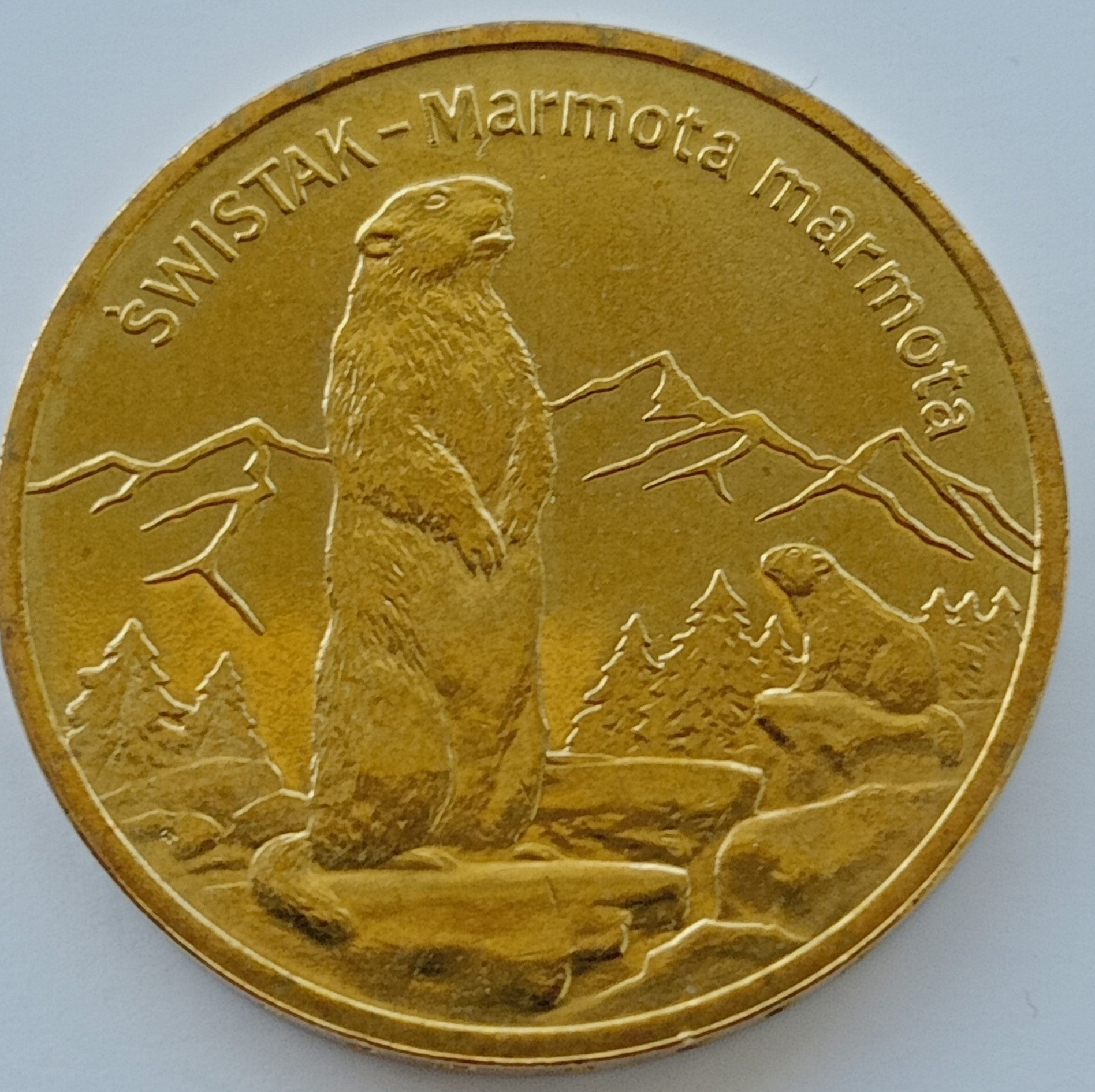 Na rewersie sylwetka świstaka wśród gór. Nad nim półkoliście zapisana jego polska i łacińska nazwa "ŚWISTAK - Marmota marmota". Na awersie orzeł biały ze znakiem mennicy MW i rokiem emisji monety 2006 pomiędzy flagami Polski. W dolnej części nominał "zł 2 zł", a w górnej oznaczenie emitenta RZECZPOSPOLITA POLSKA.