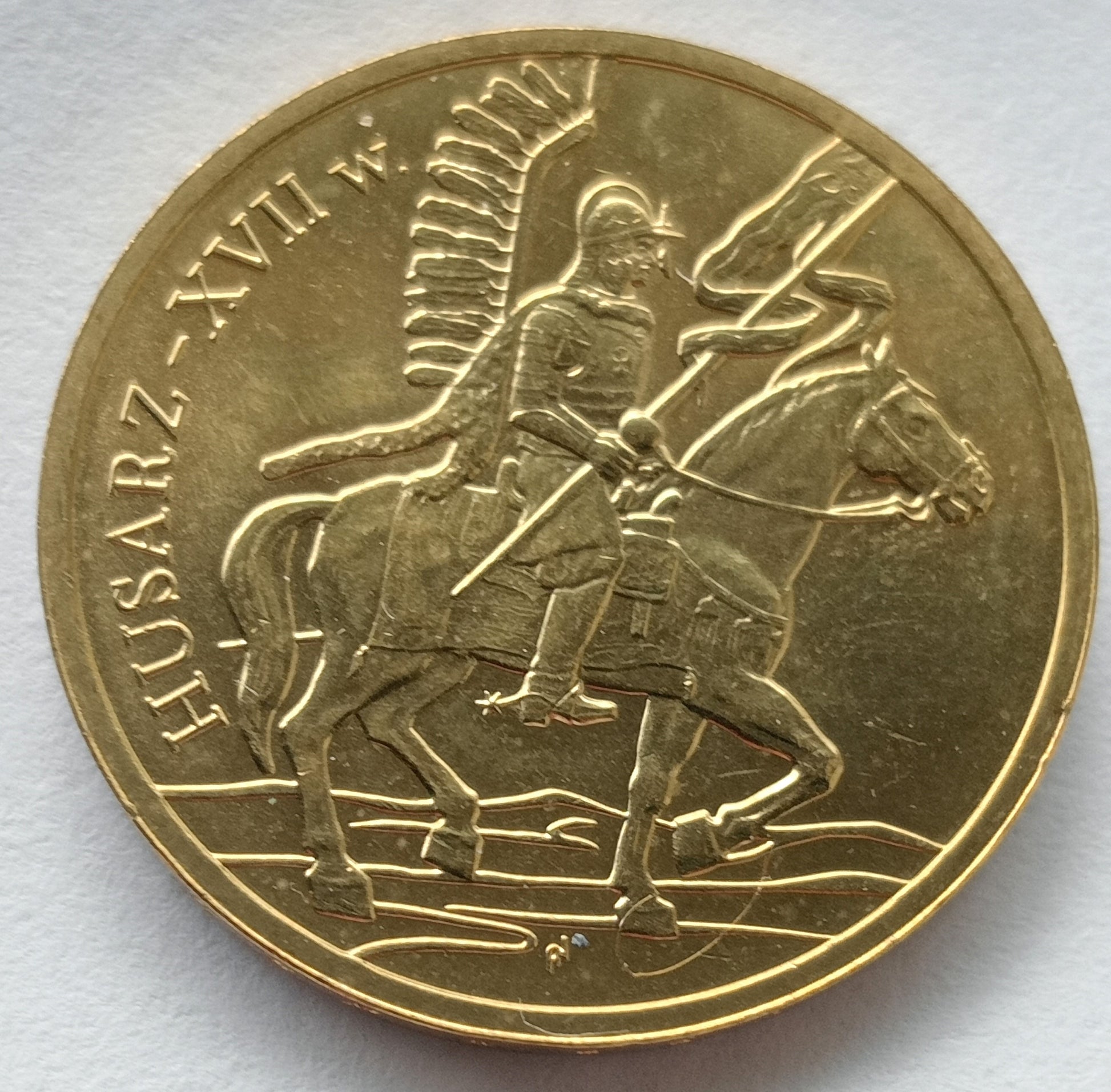 Na rewersie widnieje postać husarza z charakterystycznymi skrzydłami siedzącego na koniu. Z lewej tematyczny napis "HUSARZ - XVII w.". Na awersie monety nazwa emitenta RZECZPOSPOLITA POLSKA. Poniżej godło pod postacią orła. Pod jego łapą znak mennicy MW. Ptak dzieli rok emisji 2009. Na dole nominał zapisany w sposób "zł 2 zł".