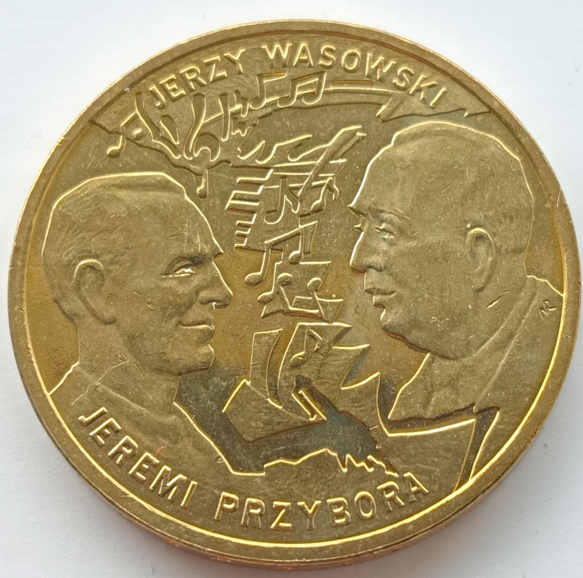 Na rewersie profile 2 artystów: z lewej Jeremiego Przybory, z prawej Jerzego Wasowskiego. Poniżej imię i nazwisko pierwszego, powyżej drugiego. Artystów oddziela kompozycja graficzna nawiązująca do zapisów muzycznych. Na awersie godło RP, jej pełna nazwa, pod łapą orła znak mennicy MW, poniżej nominał. Po bokach podzielony rok emisji 2011.