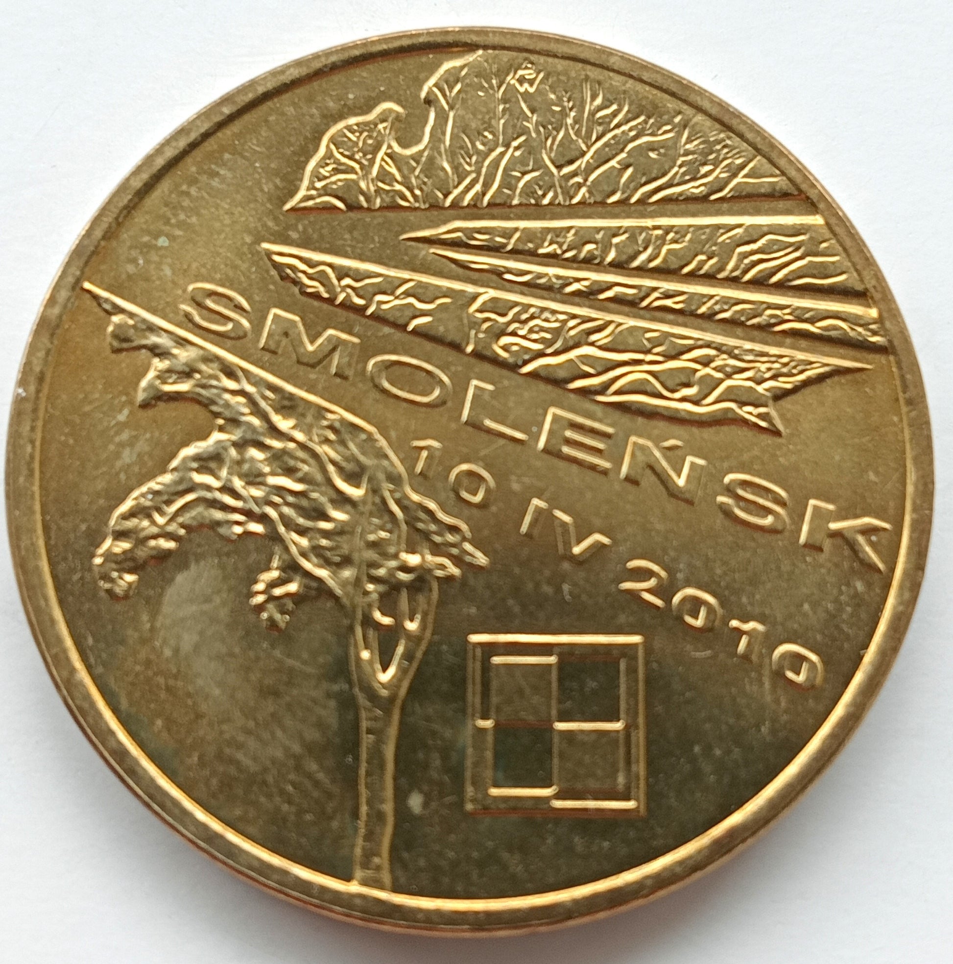 Na rewersie wizerunki drzew, napis "SMOLEŃSK 10 IV 2010" i szachownica - znak Sił Powietrznych Rzeczypospolitej Polskiej. Na awersie pełna nazwa państwa emitującego RZECZPOSPOLITA POLSKA, godło orzeł biały, który pod pazurami ma stylizowany znak mennicy MW, rok emisji 2011 i u dołu nominał zapisany jako "zł 2 zł".