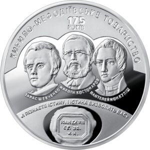 Rewers: Portrety członków towarzystwa: od lewej; T. Szewczenko, M. Kostomarov, P. Kulish „ТАРАС ШЕВЧЕНКО, НИКОЛАЙ КОСТОМАРОВ, ПАНТЕЛЕЙМОН КУЛІШ” , poniżej - nadruk pieczęci woskowej; inskrypcje: u góry półkolem „КИРІЛЛО-МЕТОДІЄВСЬКЕ СУСПІЛЬСТВО” (Ciril-Methodio Society), „175 / РОКІВ” (Rok „І ЗНАЙТЕ ПРАВДУ, І ІСТИНА ЗРОБИТЬ ВАС ВІЛЬНИМ” (I poznaj prawdę, a prawda cię wyzwoli)