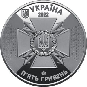 Awers: W centrum godło Państwowej Służby Łączności Specjalnej i Ochrony Informacji Ukrainy. U góry mały herb państwowy Ukrainy, nazwa państwa i data (Ukraina / 2022), u dołu logo banknotu i mennicy Narodowego Banku Ukrainy oraz półkolem nominał (pięć Hrywien), tło stylizowanej informacji w postaci cyfr kodu binarnego.