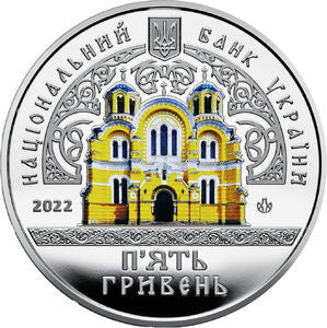 Awers: kolorowy wizerunek soboru Włodzimierza w Kijowie, po lewej data 2022, po prawej znak mennicy, u góry mały herb. Nazwa; Narodowy Bank Ukrainy, wartość tekstowa na dole w dwóch wierszach (pięć hrywien)