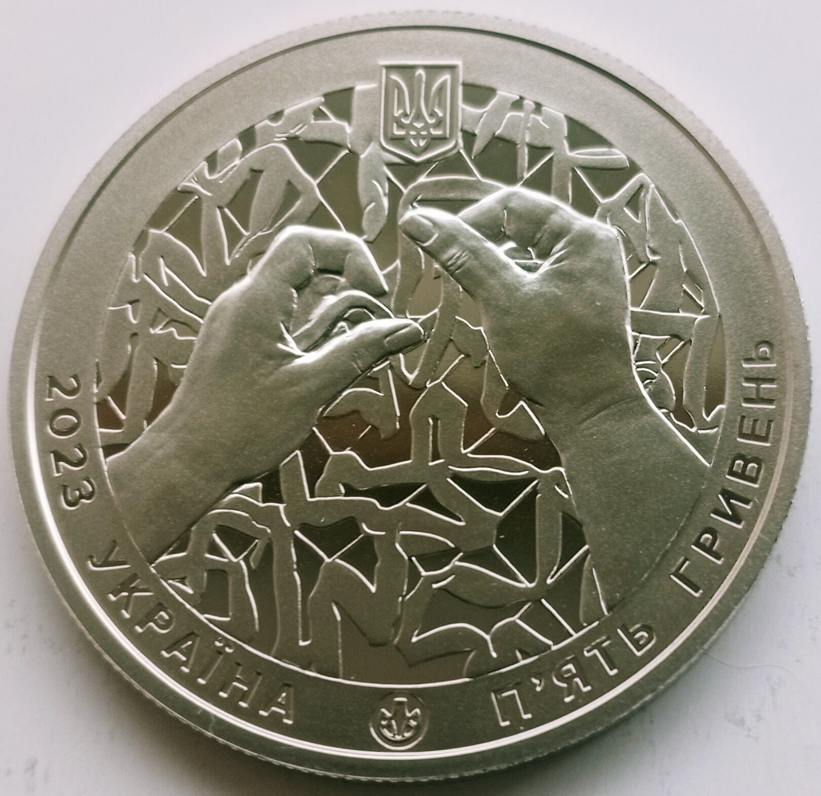 Awers: Stylizowany wizerunek rąk tkających siatkę maskującą, który symbolicznie ukazuje wolontariat jako jedną z wielu form pomocy, wszechstronnego wsparcia oraz jest ucieleśnieniem siły i jedności narodu w czasach skrajnych prób; u góry mały herb państwowy Ukrainy. Data i kraj w lewym dolnym rogu 2023 УКРАЇНА (Ukraina), u dołu znak mennicy „lilia”, nominał tekstowy w prawym dolnym rogu П’ЯТЬ ГРИВЕНЬ.