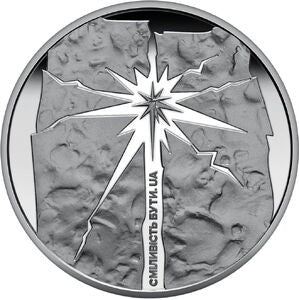Rewers: Kompozycja reprezentująca ukraińską odwagę i bohaterski opór. W centrum znajduje się złota gwiazda, która jaśnieje nową nadzieją (następuje tu symboliczne porównanie z Gwiazdą Betlejemską). Motyw w pionie pośrodku СМІЛИВІСТЬ БУТИ. UA. (Odwaga bycia. UA).