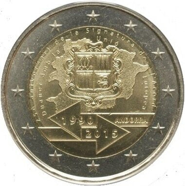 Pomimo członkostwa w strefie euro Andora nie należy do Unii Europejskiej. Podpisała jednak z nią unię celną, której 25-lecie uhonorowała okolicznościowymi monetami euro. Motywem ich awersu jest mapa Andory, jej herb, oraz strzałki z latami 1990 i 2015. Od strony lewej półkoliście wzdłuż otoku biegną napisy „25è aniversari de la Signatura de l’Acord Duaner amb la Unió Europea” („25 rocznica podpisania umowy o unii celnej z Unią Europejską”). Nazwa państwa emitującego "ANDORRA" ("ANDORA") po prawej w części dolnej.