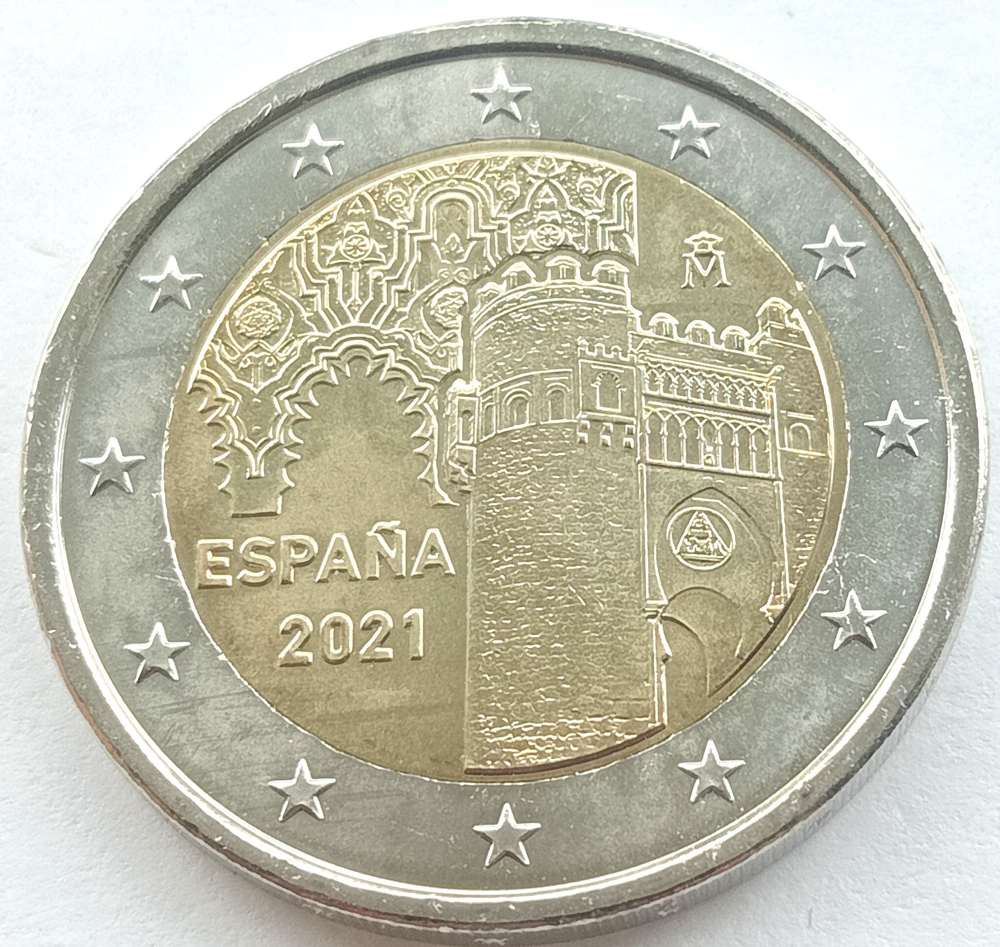 Okolicznościowa moneta poświęcona miastu Toledo. Centralnym punktem awersu jest motyw z żydowskiej świątyni Synagoga El Tránsito powstałej w latach 1356-1357 oraz "Puerto de Sol" ("Brama słońca"). Z lewej nazwa państwa emitującego "ESPAÑA" ("HISZPANIA") oraz data "2021".