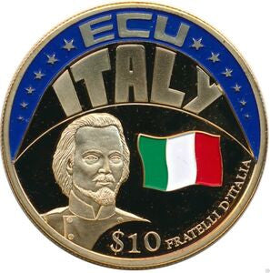 Rewers: Popiersie po prawej i kolorowa flaga, wartość i motyw „$10 FRATELLI D ITALIA”, nazwa serii dzieli się na 12 gwiazdek „ECU”, Temat „ITALY”