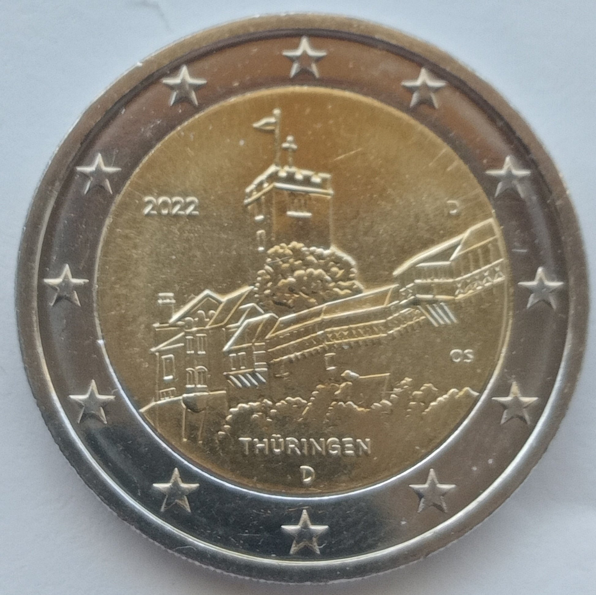 Awers: Thüringen, Zamek Wartburg TÜRINGEN i litera D (Niemcy) dla państwa wydającego. Po lewej stronie rok emisji 2022, po prawej stronie symbol danej mennicy (A, D, F, G, J) oraz inicjały OS autorstwa projektanta Olafa Stoya. W okrągłej koronie monety znajduje się dwanaście pięciopunktowych gwiazd flagi europejskiej.