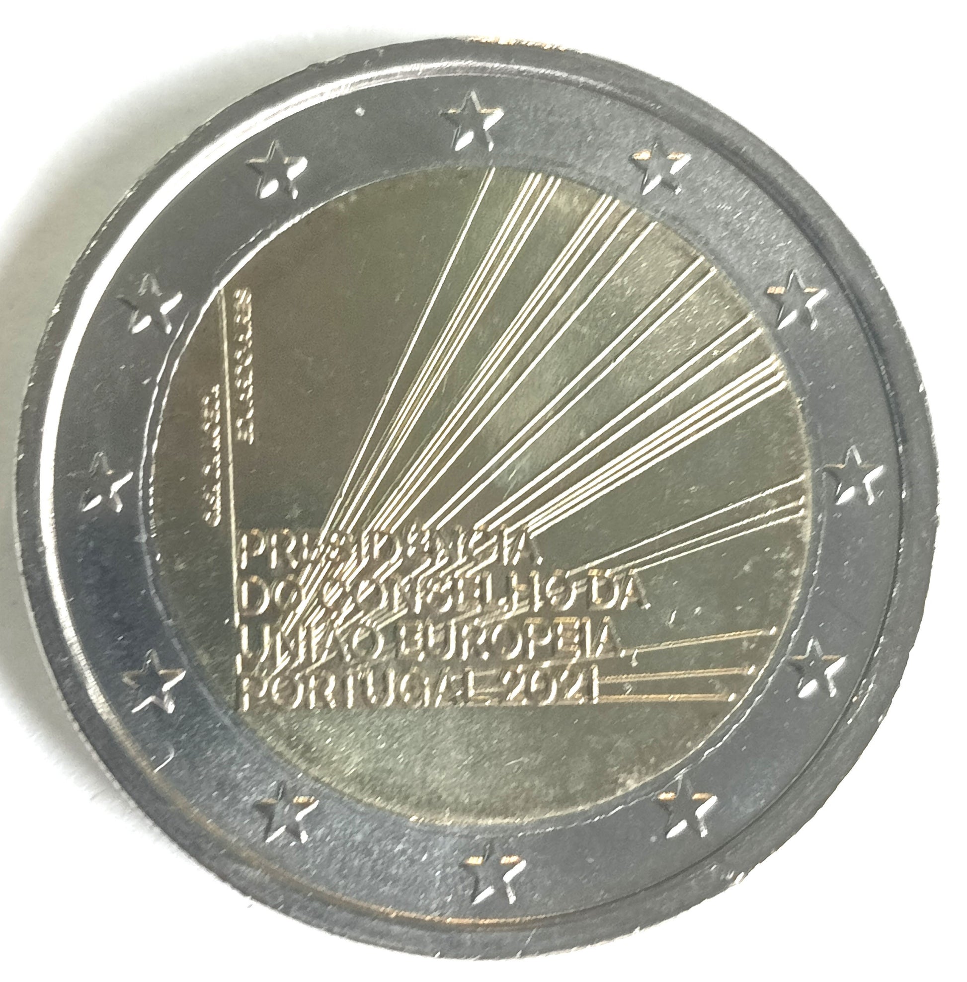 Portugalska moneta okolicznościowa euro poświęcona prezydencji tego państwa w Unii Europejskiej w 2021 roku. Widoczne na awersie linie odchodzące od napisu „PRESIDÊNCIA DO CONSELHO DA UNIÃO EUROPEIA PORTUGAL 2021” („PREZYDENCJA W RADZIE UNII EUROPEJSKIEJ PORTUGALIA 2021”), symbolizują połączenie stolicy Portugalii Lizbony z innymi tego typami miejscowościami w innych krajach Wspólnoty. W lewej części pionowo oznaczenie mennicy oraz projektanta Eduardo Aires'a.