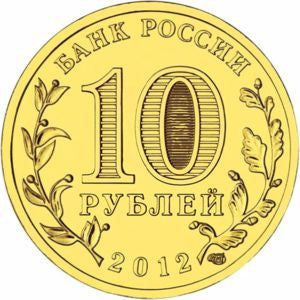 Awers: na środku krążka - oznaczenie nominału monety „10 РУБЛЕЙ” (10 rubli). Wewnątrz cyfry „0” - ukryte zdjęcia cyfry „10” i napisu „РУБ” (RUB) widoczne na zmianę przy zmianie kąta widzenia. W otoku koliste napisy, u góry: „БАНК РОССИИ” (Bank Rosji), u dołu data: „2012”, z lewej stylizowany wizerunek gałązki wawrzynu, z prawej strony dębu .