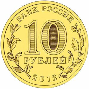 Awers: na środku krążka - oznaczenie nominału monety „10 РУБЛЕЙ” (10 rubli). Wewnątrz cyfry „0” - ukryte zdjęcia cyfry „10” i napisu „РУБ” (RUB) widoczne na zmianę przy zmianie kąta widzenia. W otoku koliste napisy, u góry: „БАНК РОССИИ” (Bank Rosji), u dołu data: „2012”, z lewej stylizowany wizerunek gałązki wawrzynu, z prawej strony dębu .