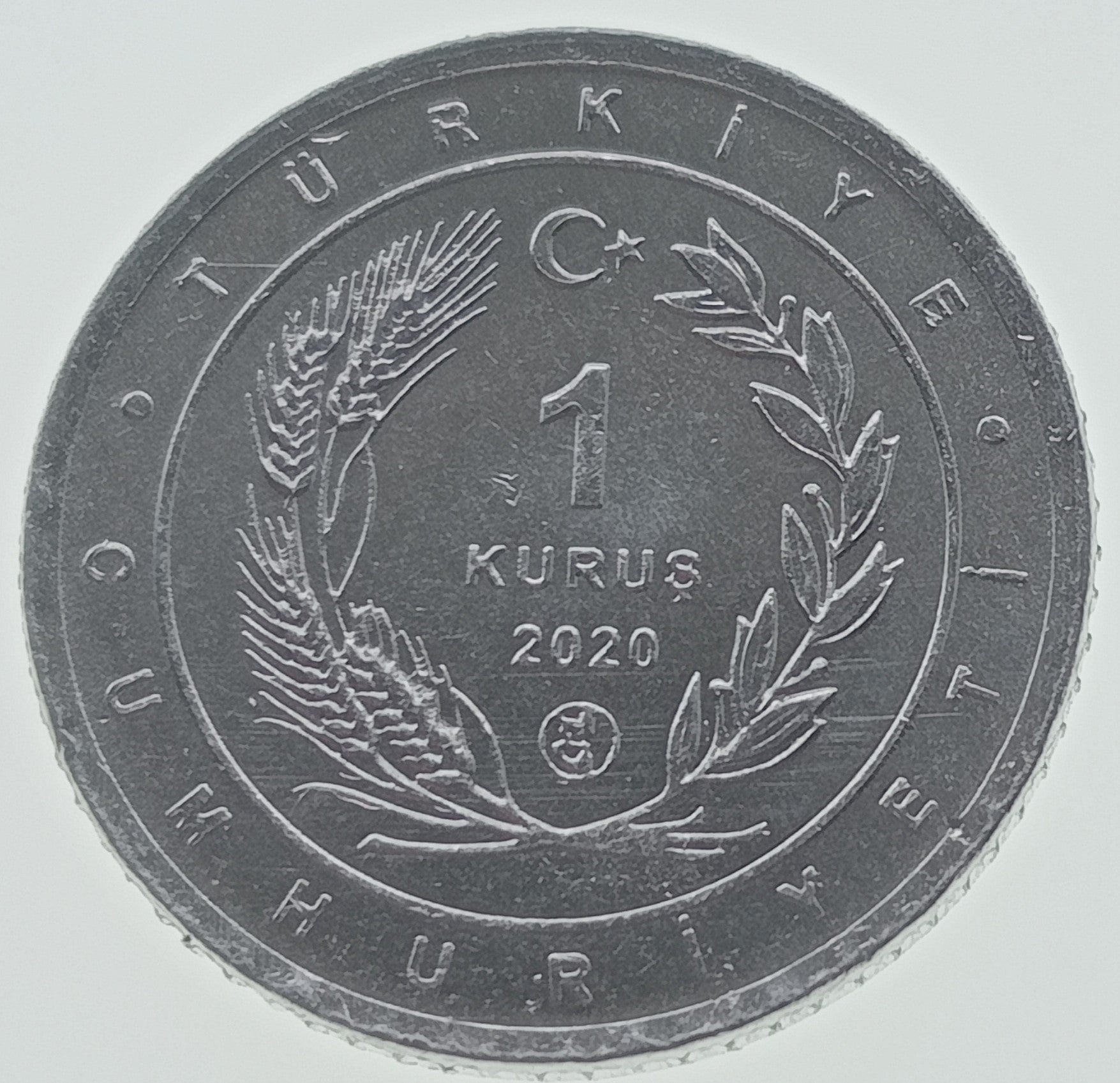 Awers: wartość i data "1 / KURUŞ / 2020", znak mennicy (Darphane, Turecka Mennica Państwowa) wewnątrz wieńca z czterech kłosów i gałązki oliwnej z emblematem u góry półksiężyc z pięcioramienną gwiazdą. Nazwa państwa „TÜRKİYE • CUMHURİYETİ •” (Republika Turcji)