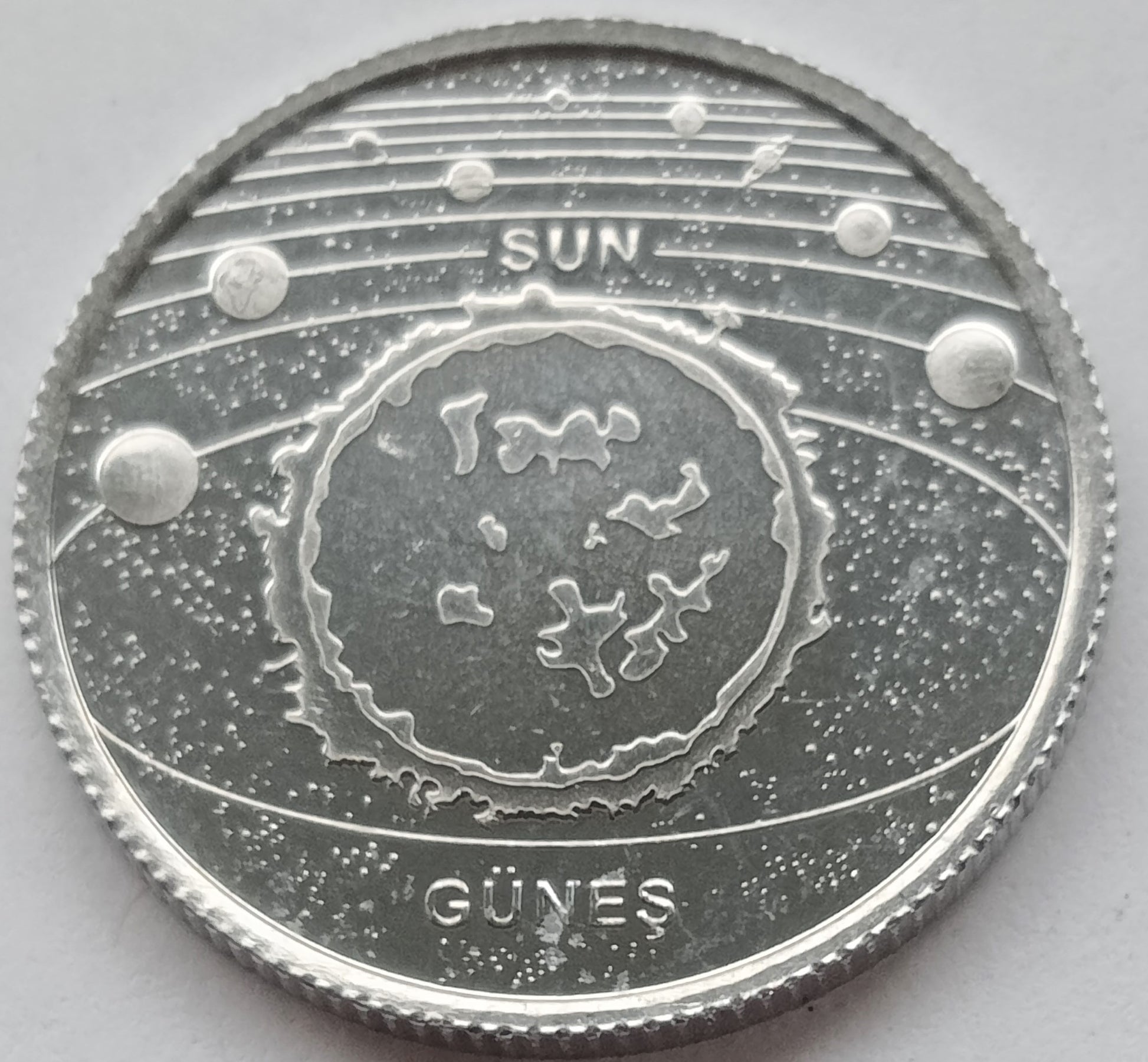 Awers: Godło narodowe półksiężyc z pięcioramienną gwiazdą, w centrum układu słonecznego; nazwa państwa w języku angielskim REPUBLIC OF TÜRKiYE, nominał i data 1 KURUŞ 2022, nazwa państwa TÜRKİYE • CUMHURİYETİ • (Republika Turcji), znak mennicy u dołu.