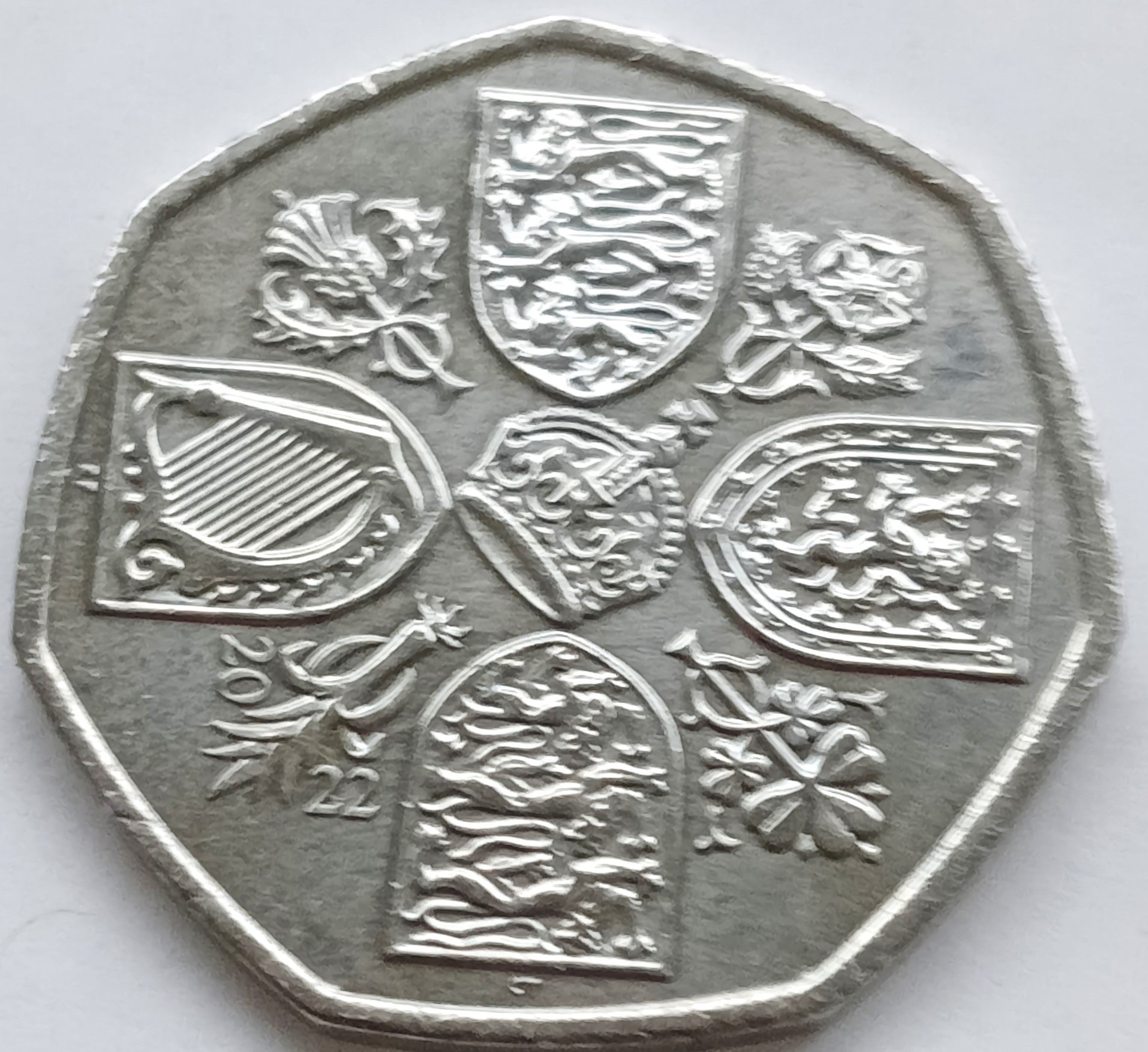 Rewers: Mała korona między tarczami tarczowymi, górny lewy i dolny prawy, Anglia, górny prawy, Szkocja i dolny lewy, Irlandia między stylizowanymi roślinami, u góry Tudor Rose, po lewej oset, po prawej koniczyna i dolny walijski por między datą, po lewej 20 i po prawej 22. Projektanci, dolny lewy EF i dolny prawy C‧T.