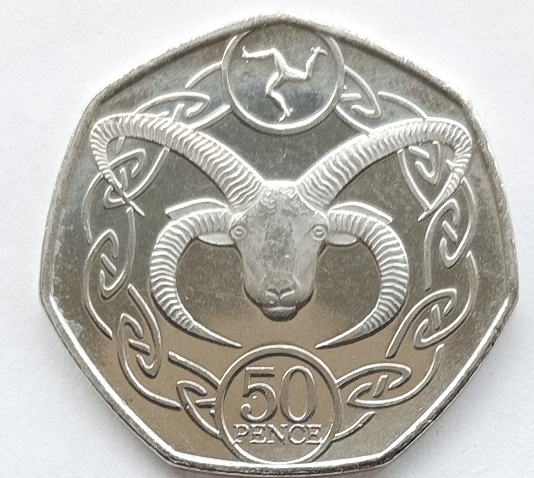 Rewers: Okrążony symbol Maxa z trzema nogami nad Manx Loaghtan (rogaty baran). Wartość w okręgu na dole 50 / PENCE.